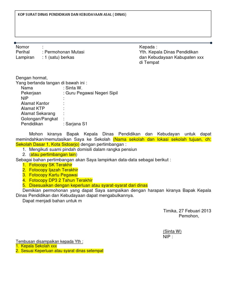 Contoh Surat Permohonan Mutasi Cpns