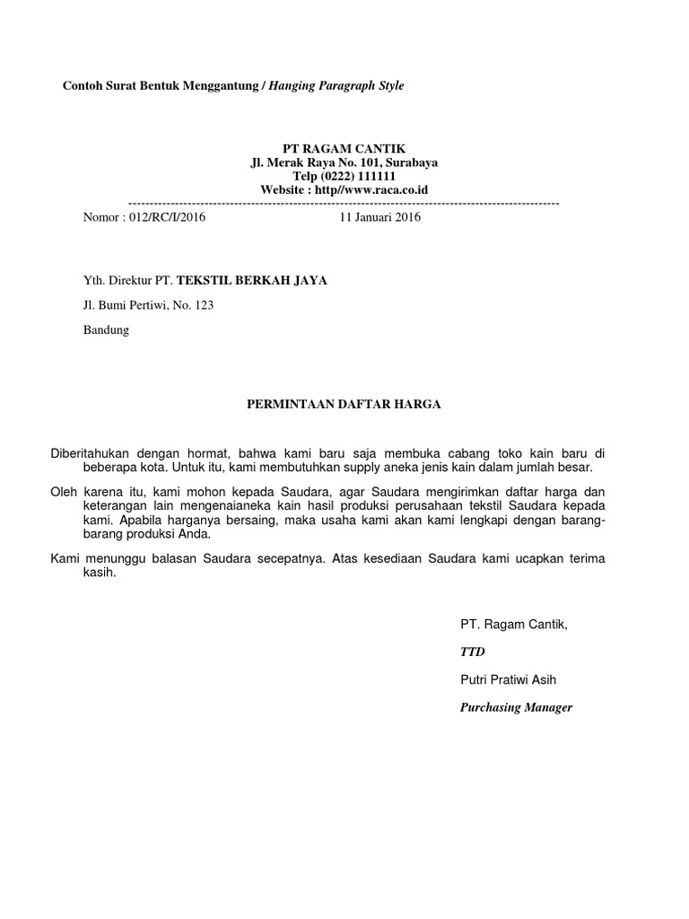 Contoh Surat Pesanan Bentuk Hanging Paragraph