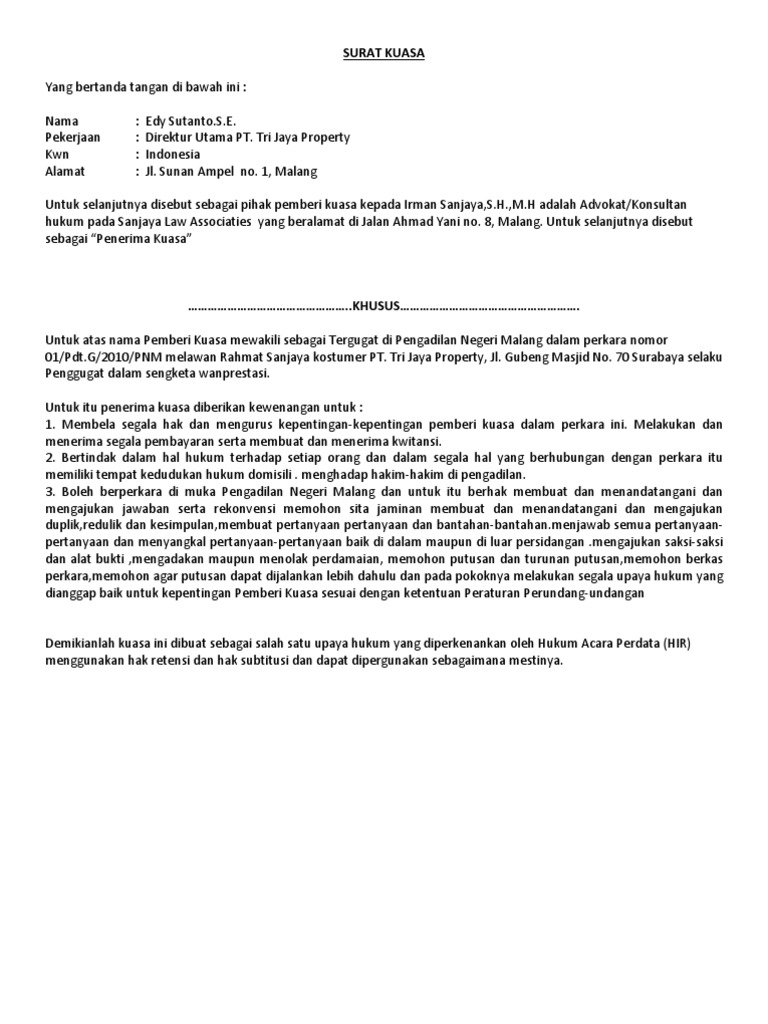Contoh surat kuasa khusus wanprestasi. 0511 334455 0852 477 172 22 banjarmasin kalimantan selatan berdasarkan surat kuasa tanggal 20 agustus 2014 terlampir bertindak untuk dan atas nama amur bertempat tinggal di jalan a. Selanjutnya penerima kuasa dikuasakan untuk menghadiri seluruh rangkaian persidangan perkara perdata wanprestasi perjanjian usaha bersama menghadap pengadilan instansi instansi hakim panitera maupun orang ataupun badan hukum yang berkaitan dengan perkara ini membaca menyerahkan dan mengajukan segala bentuk dokumen termasuk mengajukan gugatan duplik kesimpulan mengajukan pembuktian. Academiaedu is a platform for academics to share research papers.