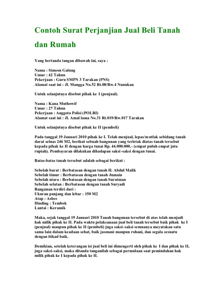 Contoh Surat Perjanjian Jual Beli Tanah Dan Rumah