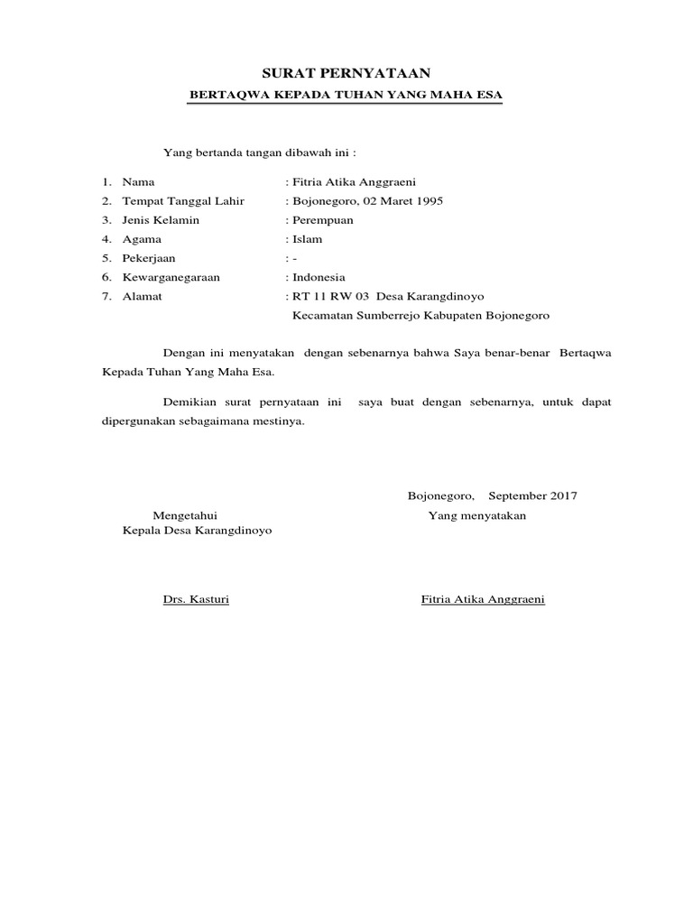 Contoh Surat Pernyataan Bertaqwa Kepada Tuhan Yang Maha Esa