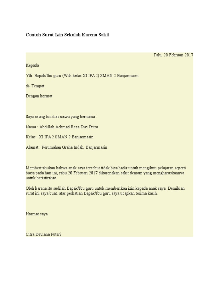 Contoh Surat Izin Sekolah Karena Sakit Pdf