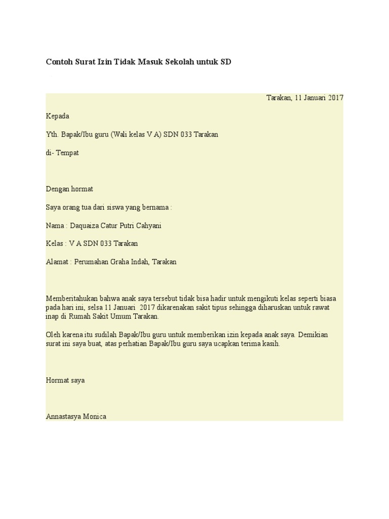 Contoh Surat Izin Tidak Masuk Sekolah Untuk Sd