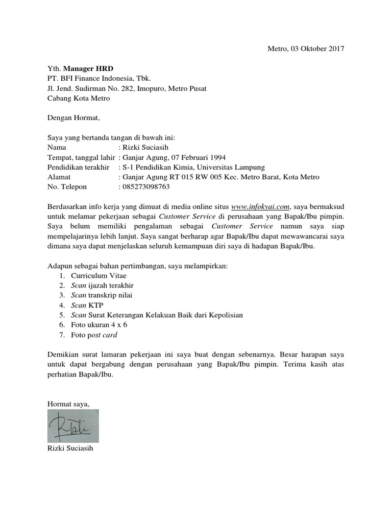 Contoh Surat Lamaran Kerja Customer Service Dalam Bahasa Indonesia