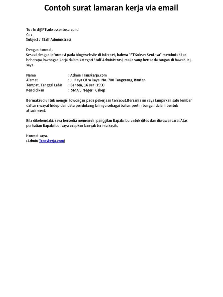 Contoh Surat Lamaran Kerja Via Email