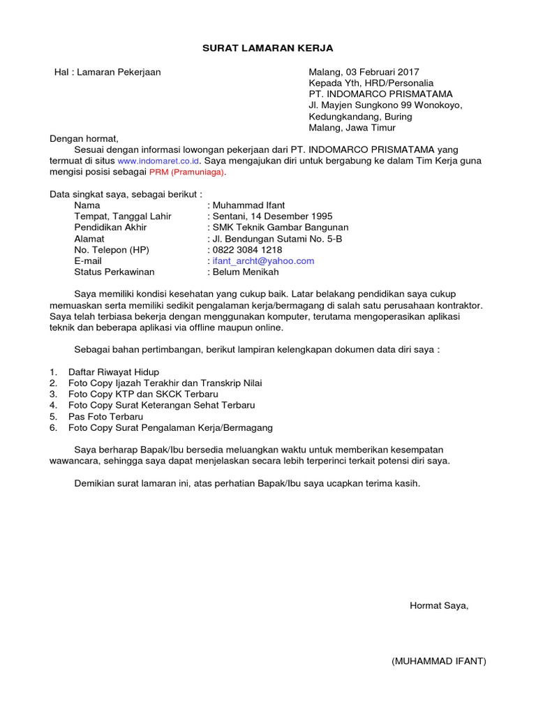 Contoh Surat Lamaran Kerja Di Indomaret Suratku